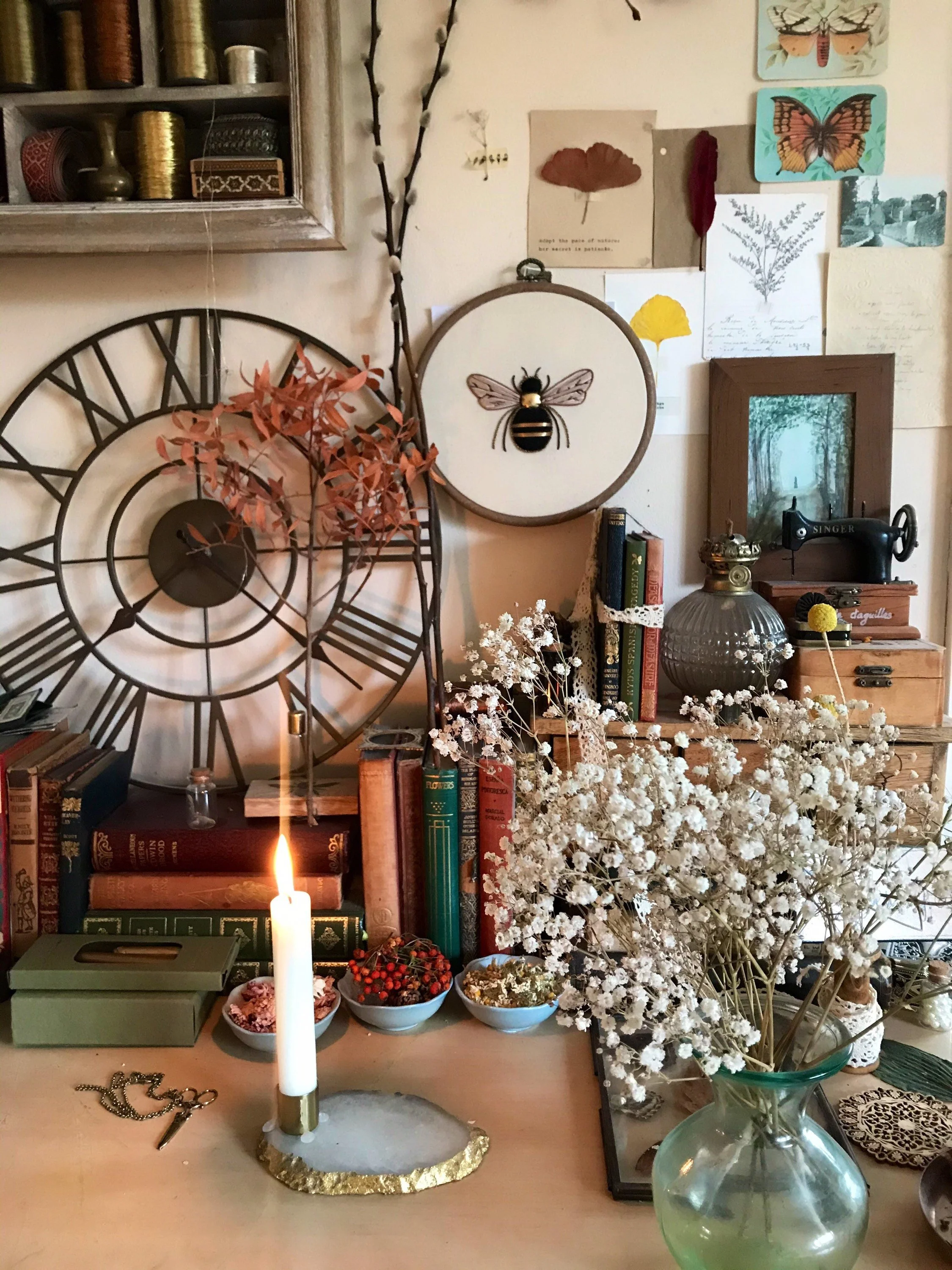 Metal wires are then individually measured and cut to size. Each wire is waxed with beeswax before being sewn on over the felt padding. The beeswax ensures the metal stays in place. I alternate between a smooth gold wire and a textured turquoise wire which creates an exquisite stripe. Other materials I have used include cotton threads, metallic threads, antique gold and turquoise beads, and a thick antique gold cords.