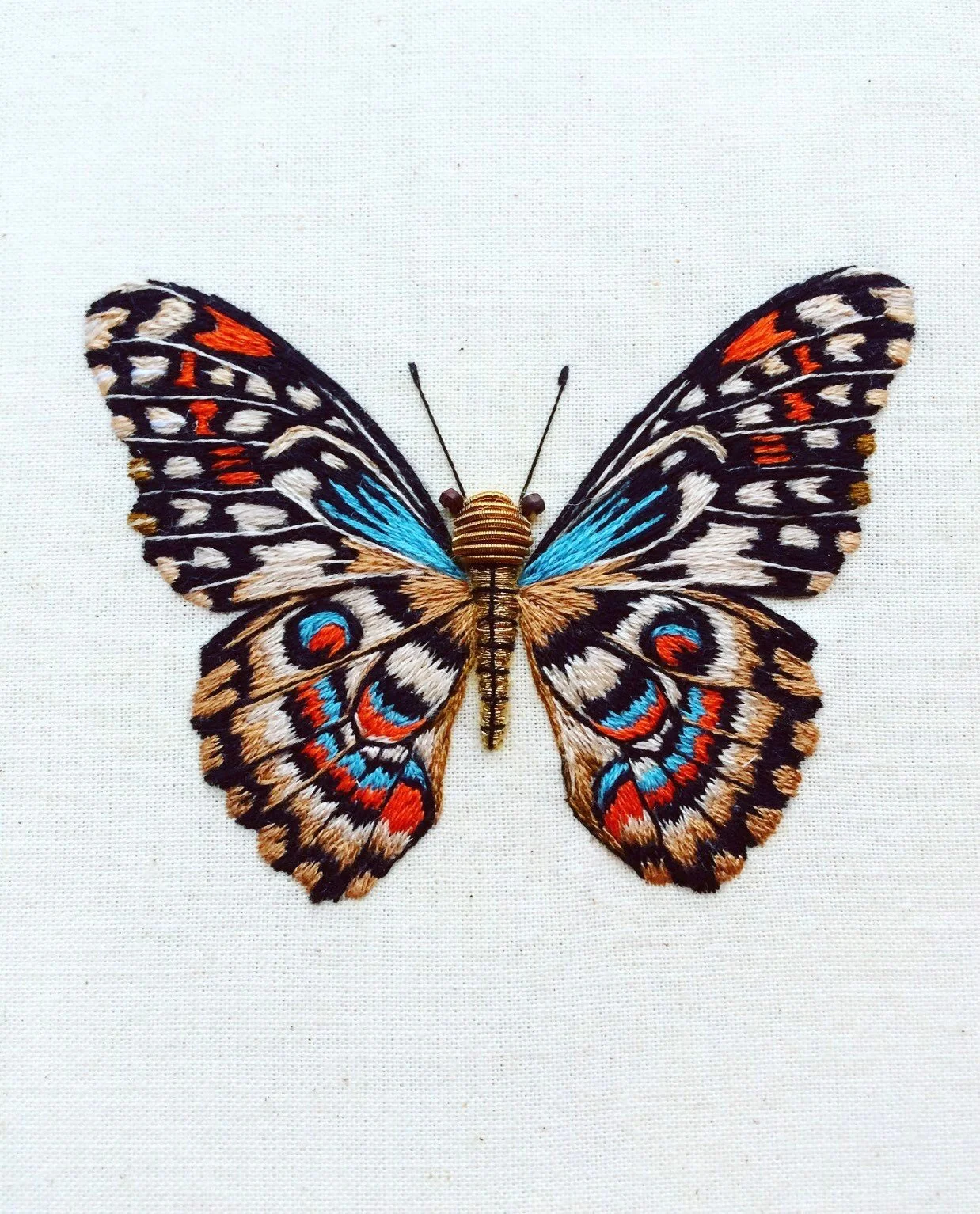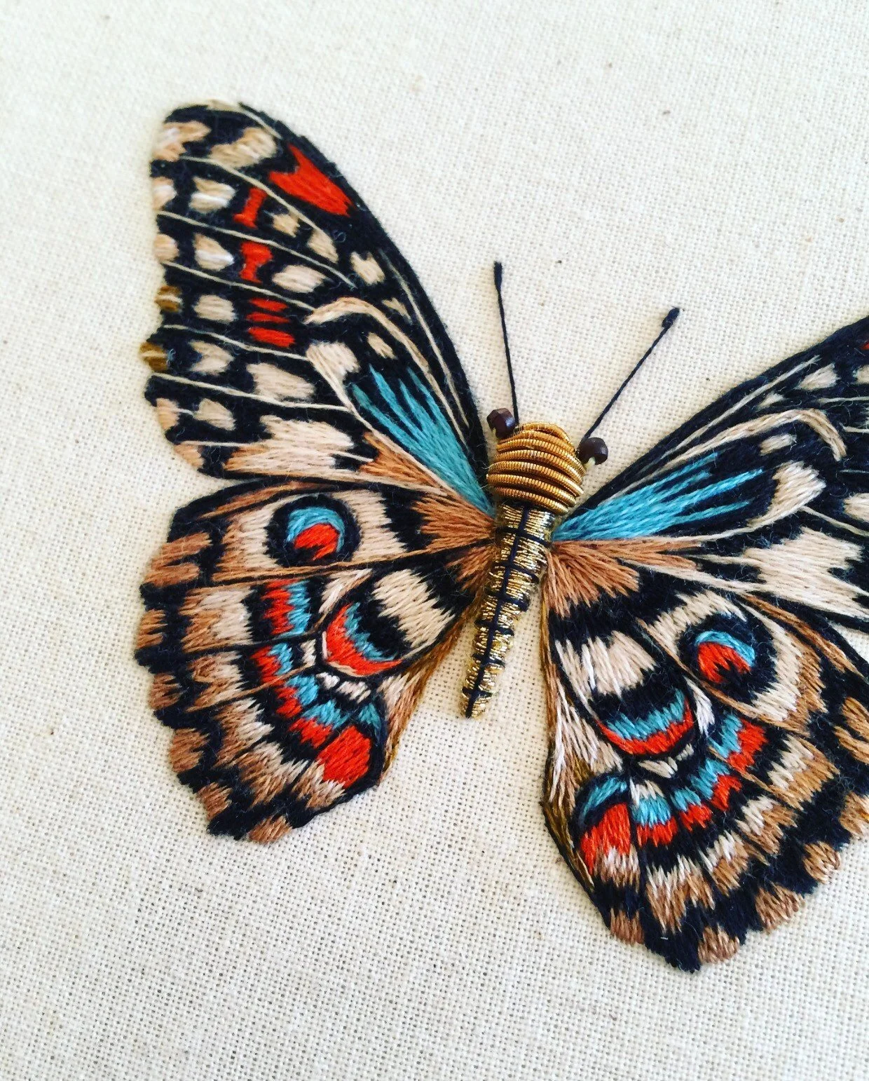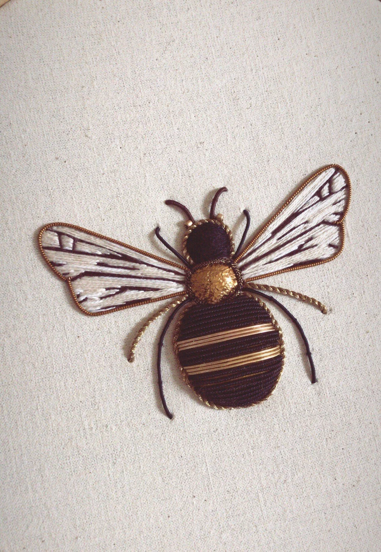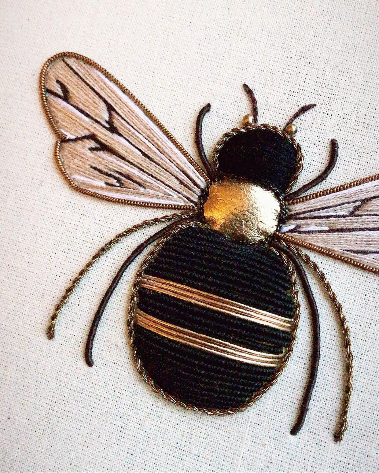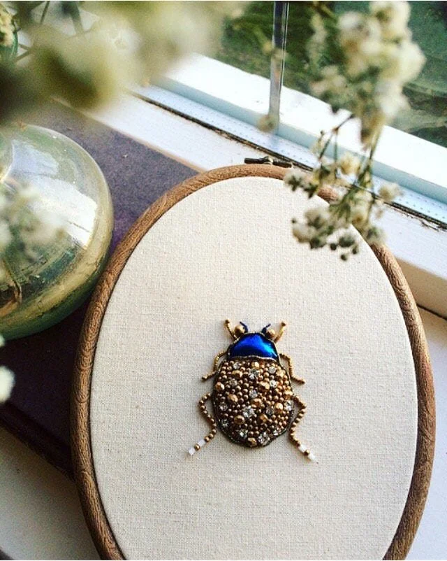 The life of this embroidered beetle began by creating a template for his body. Using several layers of felt padding, I secure a body and head on an organic cotton fabric. Beetles often have a rounded shape and I try to recreate this tapered effect with varying sizes of felt padding.