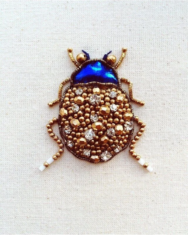 To finish off I outlined the beetle's body using a thick antique gold cord and added beads for his eyes.
